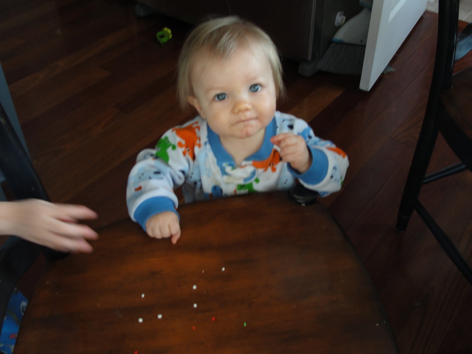 Nerds are the perfect candy for 10 month olds! Sorry guys, just had to do it. Sometimes you need a few minutes to do your own thing, and this buys me the time I need. For any of you disgusted at my early introduction to sweets in baby Dylan's diet, take comfort in knowing that most of those little nerdies get stuck forever in between his fingers. And the cookies and cake that he gets bites of here and there? Nothing compared to how many jars of baby food he partakes of in one day. He's definitely the healthiest eater in the house.